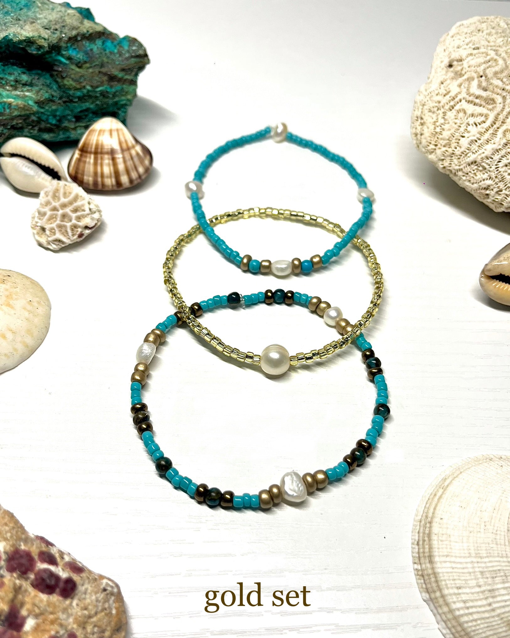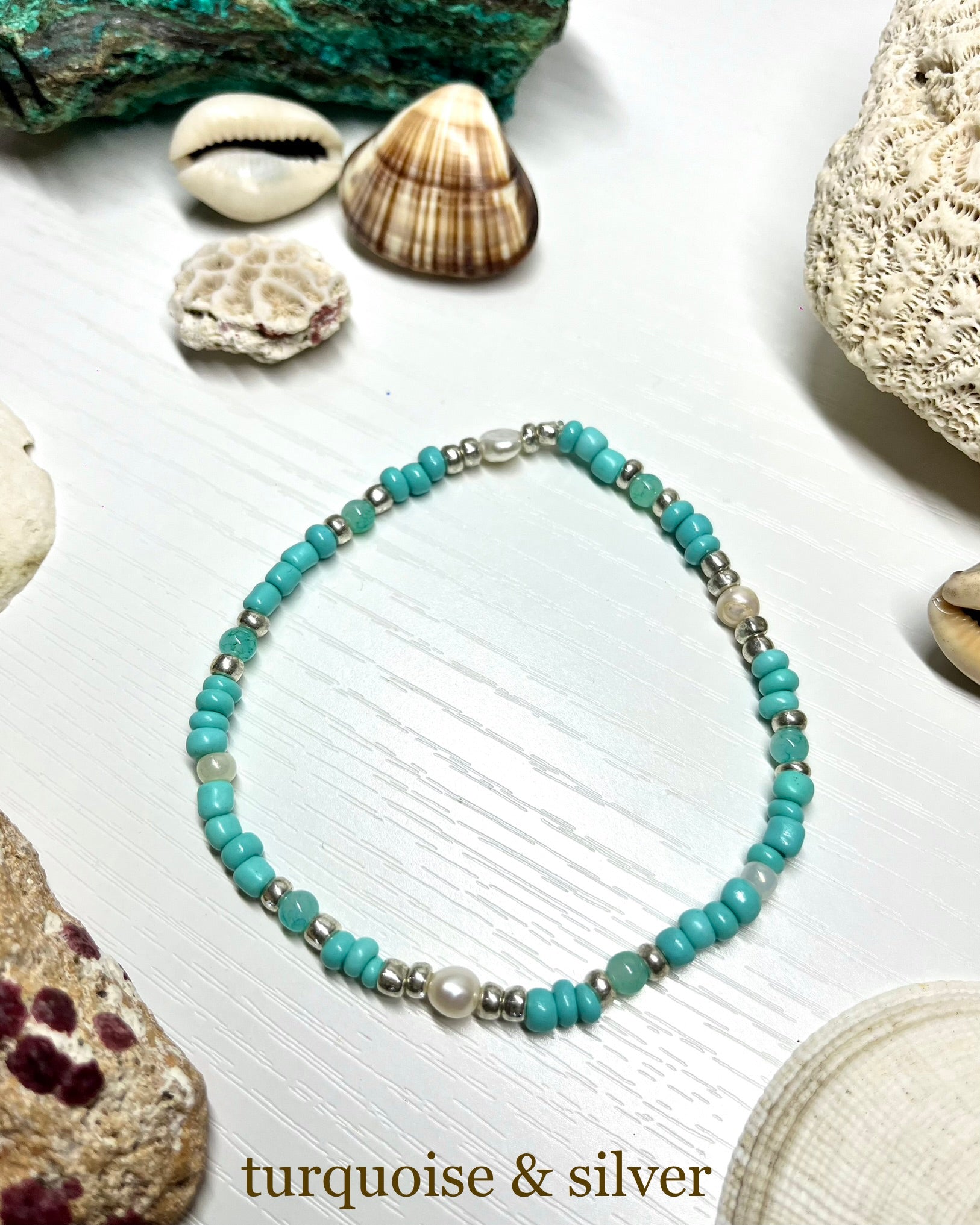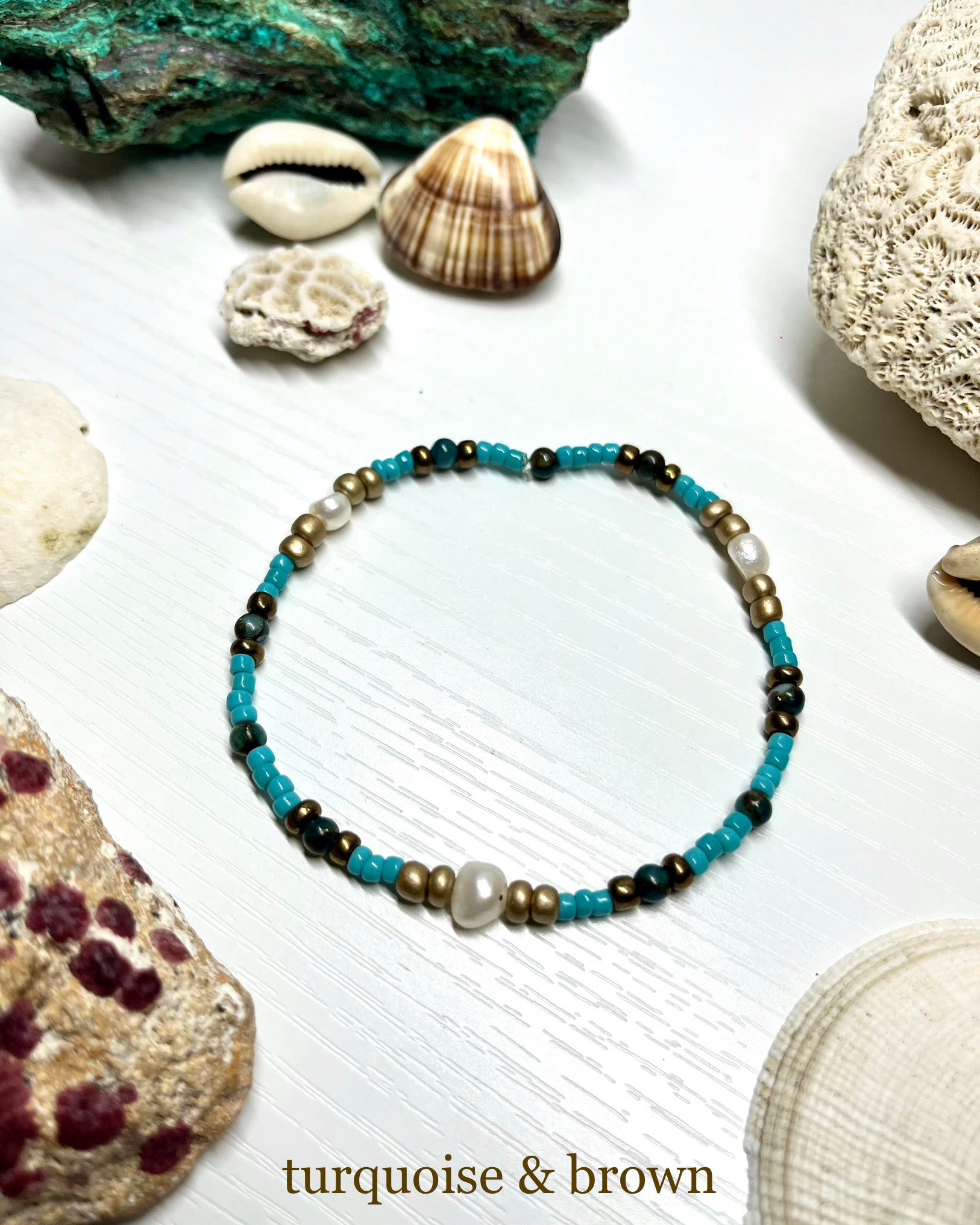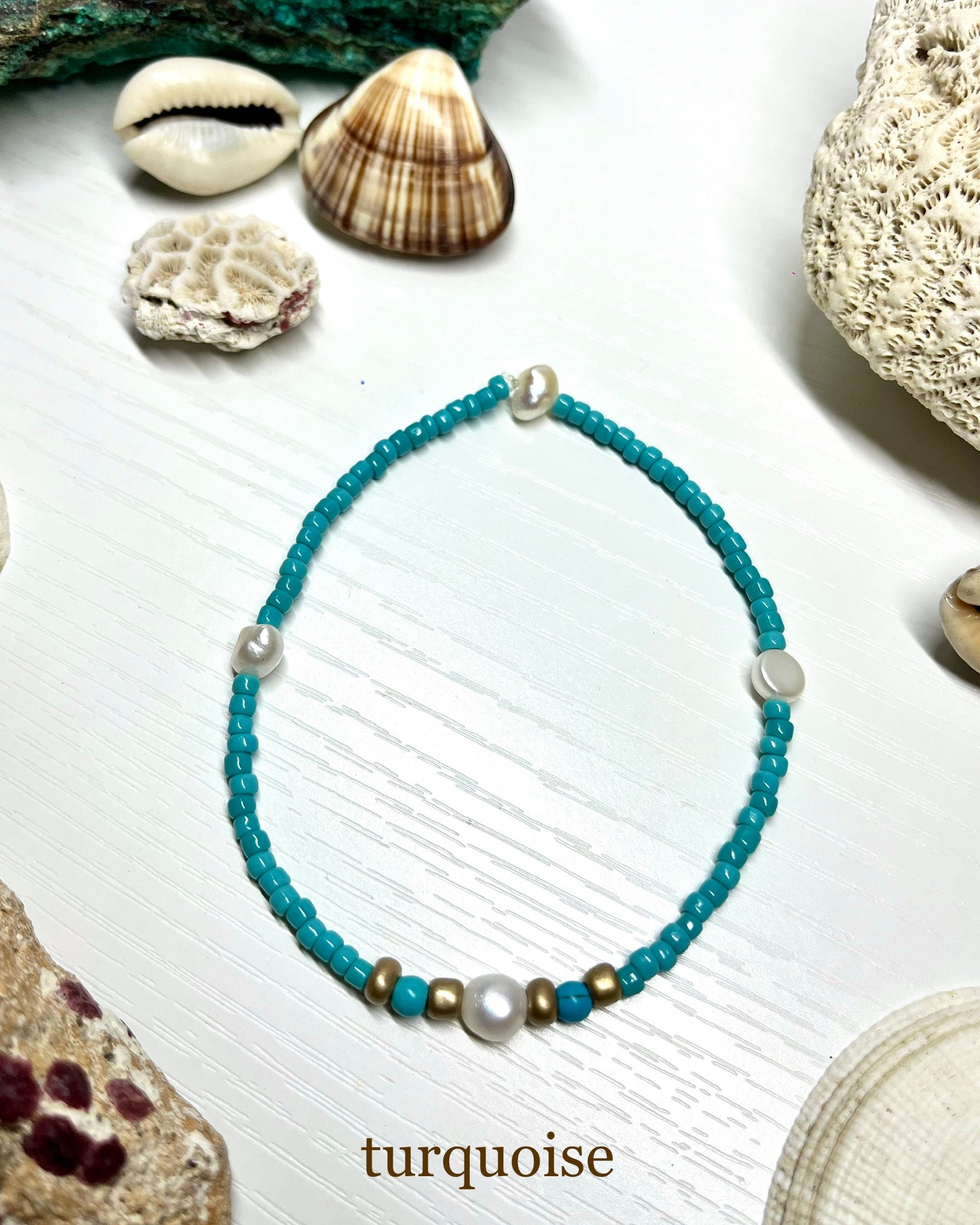 SOLyMAR collection’s stretchy anklets with freshwater pearls available in our turquoise and gold tones. These anklets of course can also be used as bracelets, which is why I am offering them in various sizes. For reference, 9 in. is the average ankle size and the average wrist size is 7.5 in.
