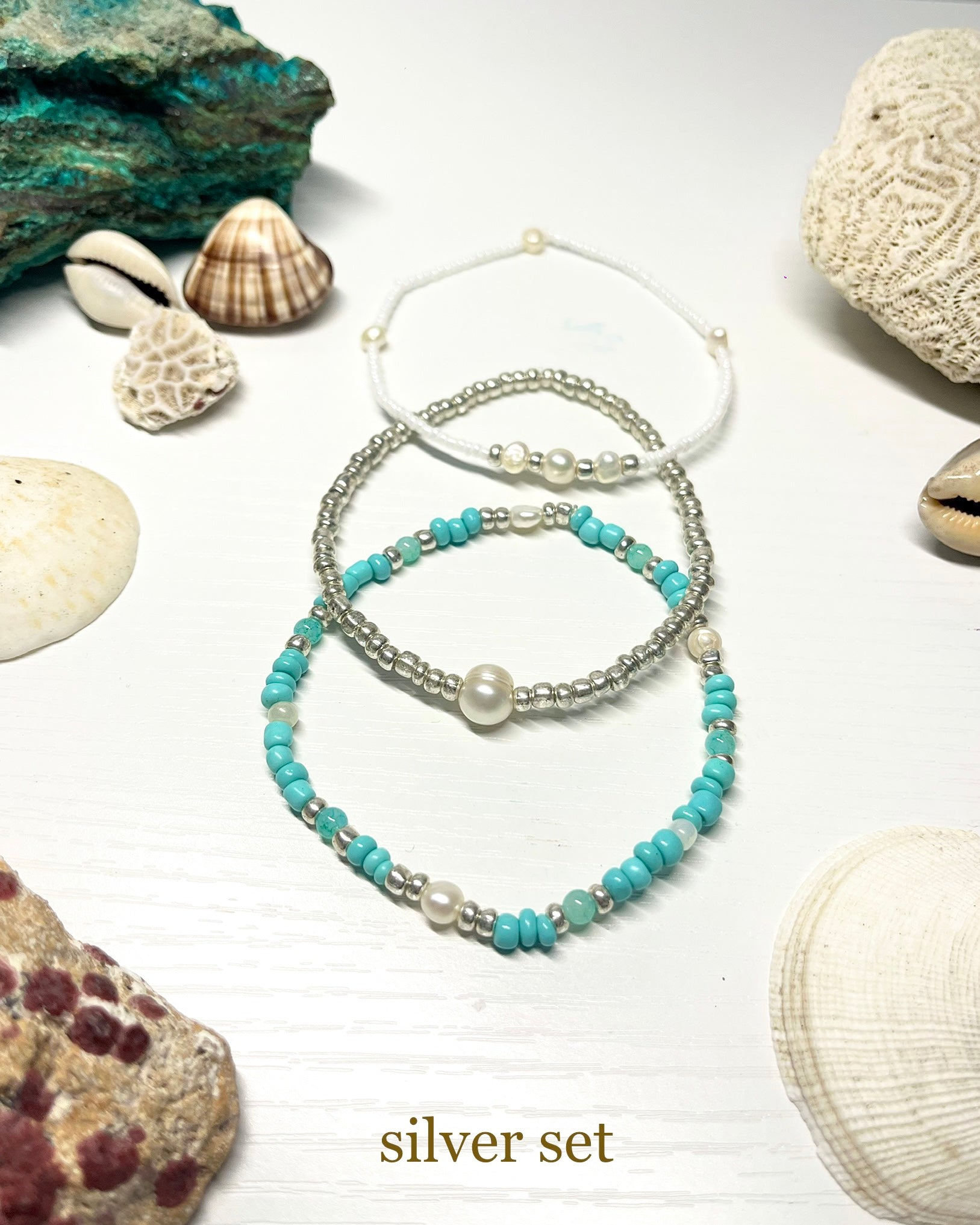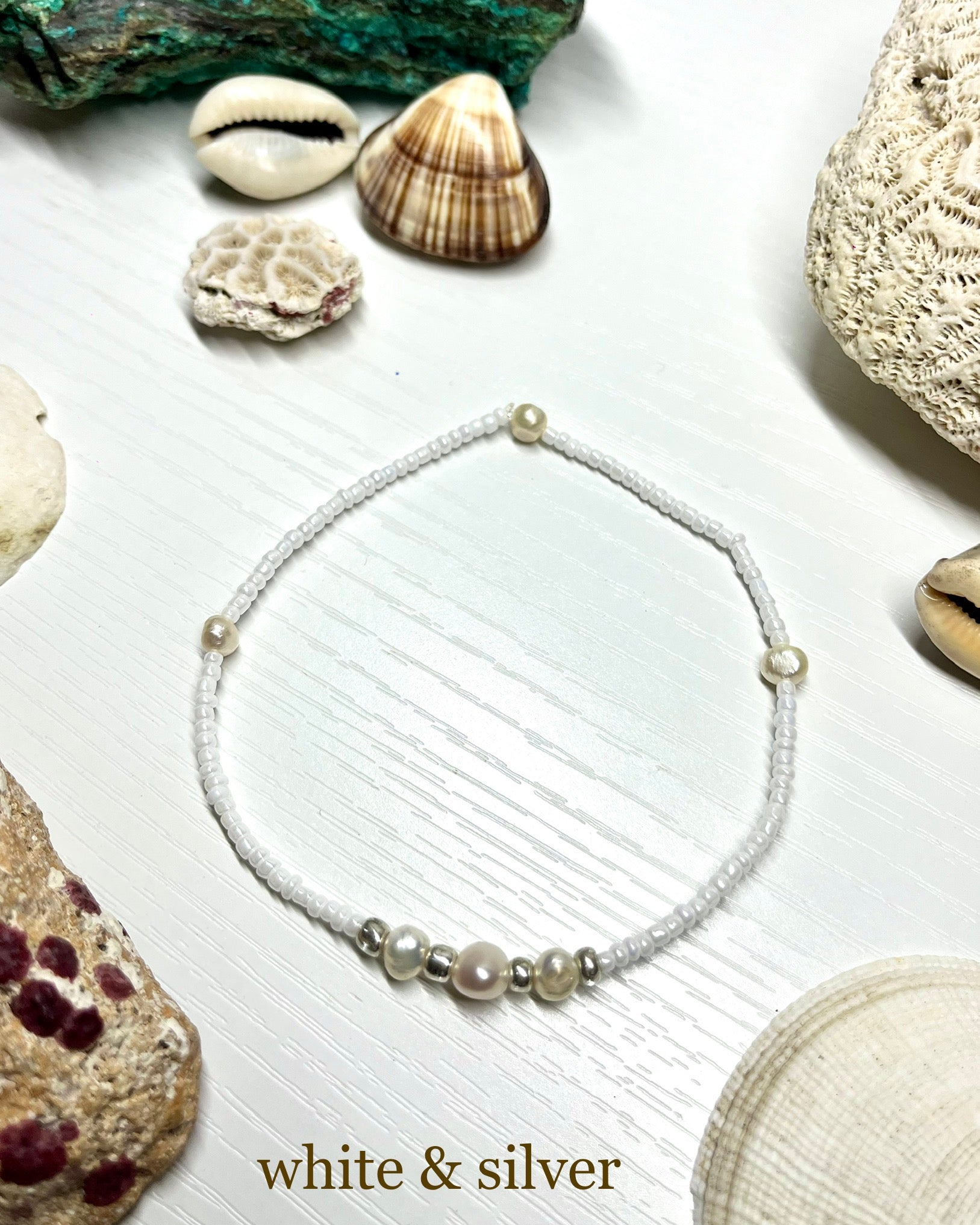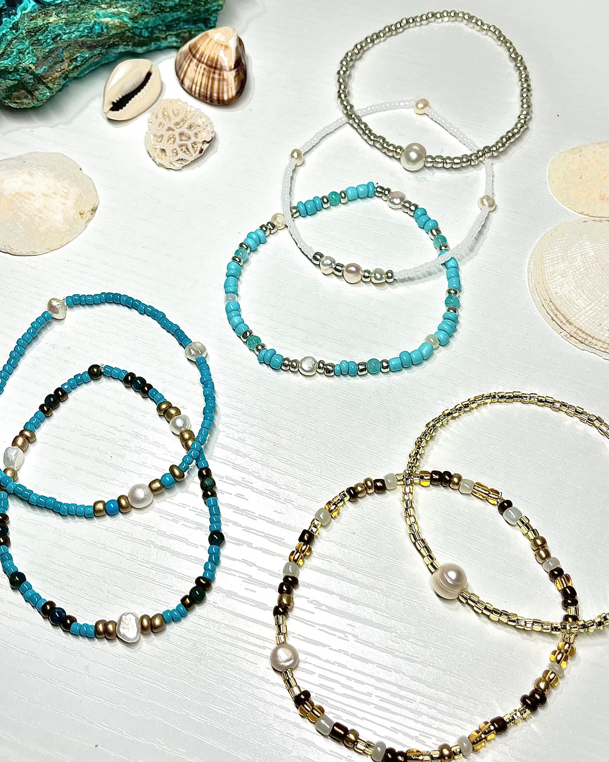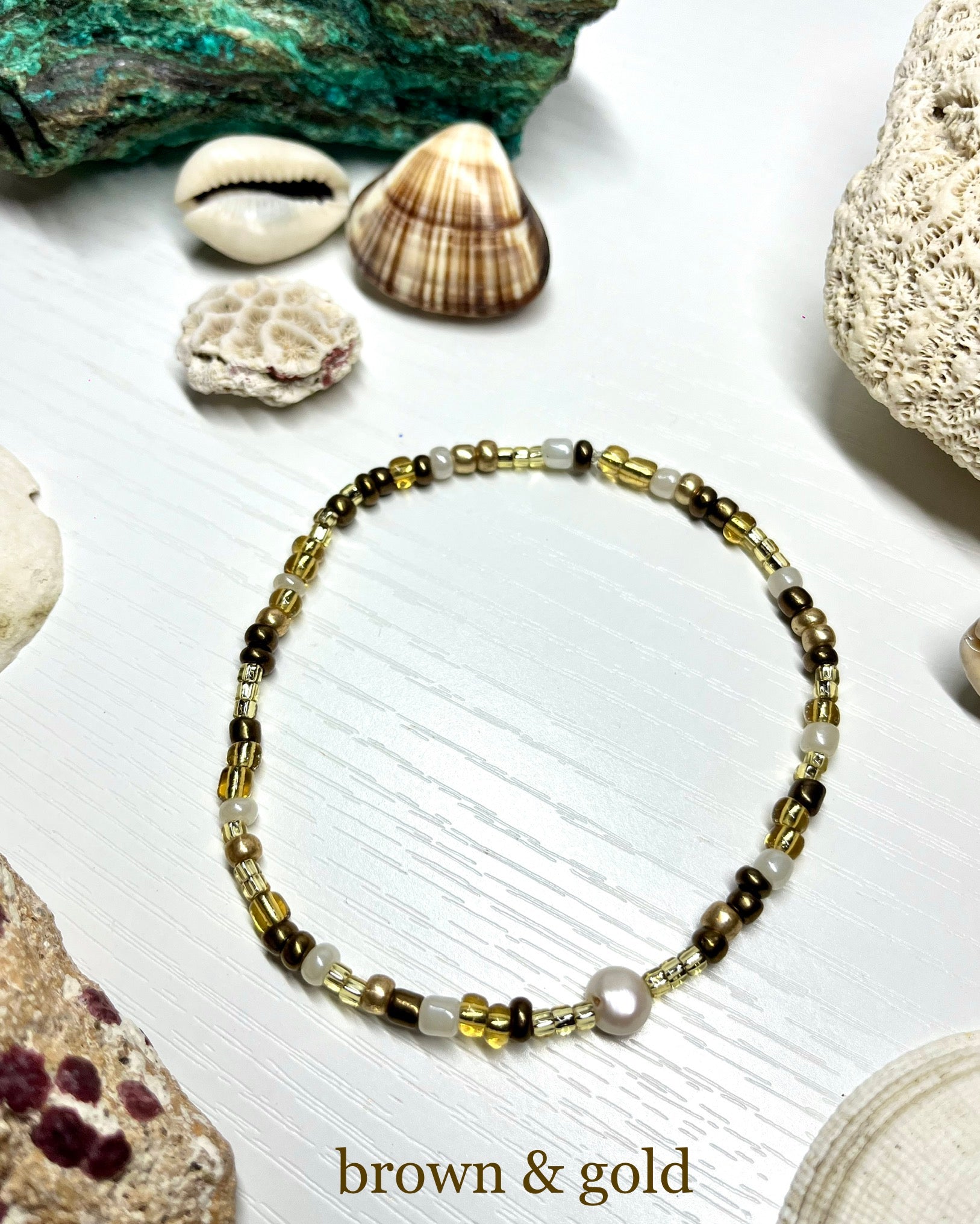 SOLyMAR collection’s stretchy anklets with freshwater pearls available in our turquoise and gold tones. These anklets of course can also be used as bracelets, which is why I am offering them in various sizes. For reference, 9 in. is the average ankle size and the average wrist size is 7.5 in.