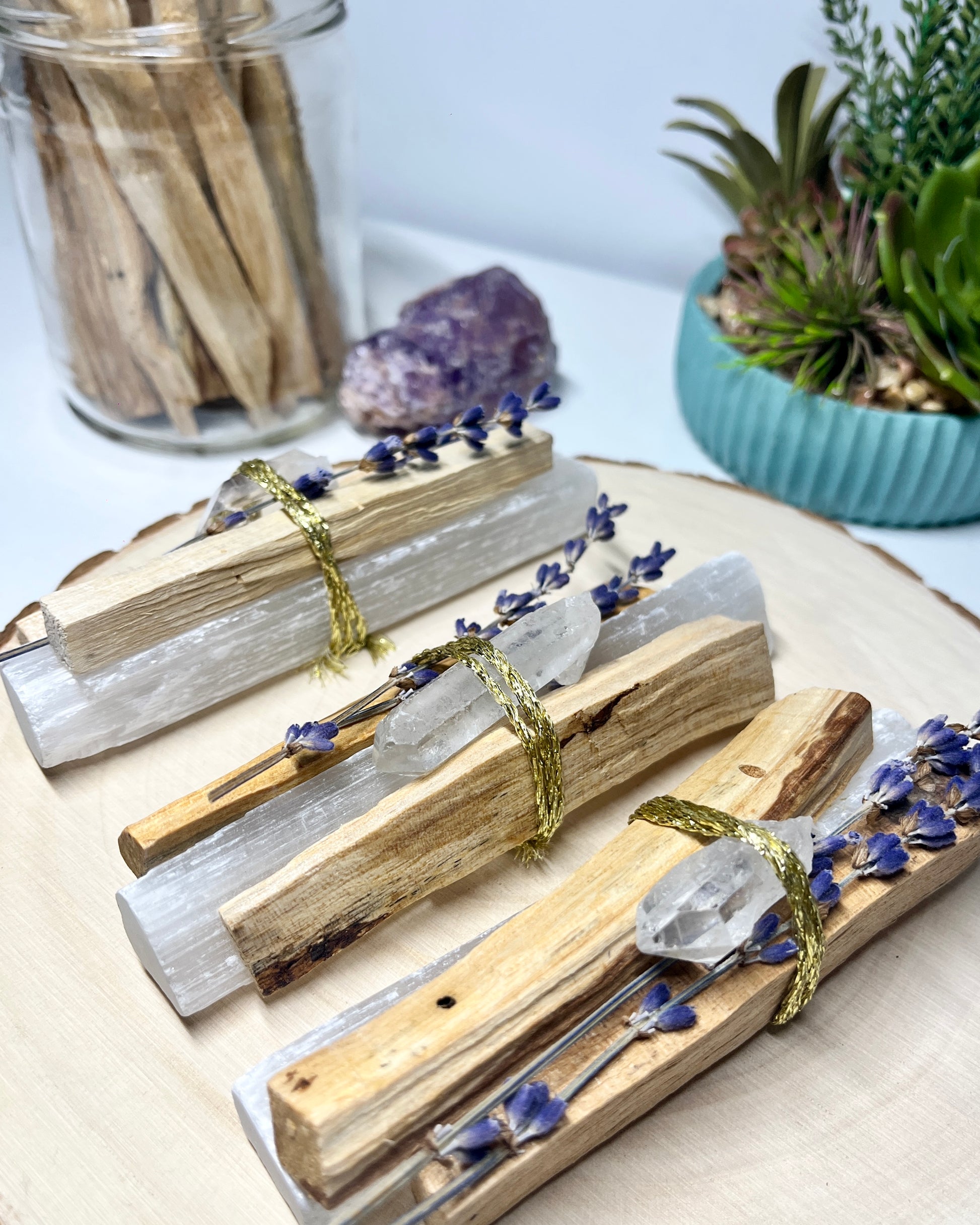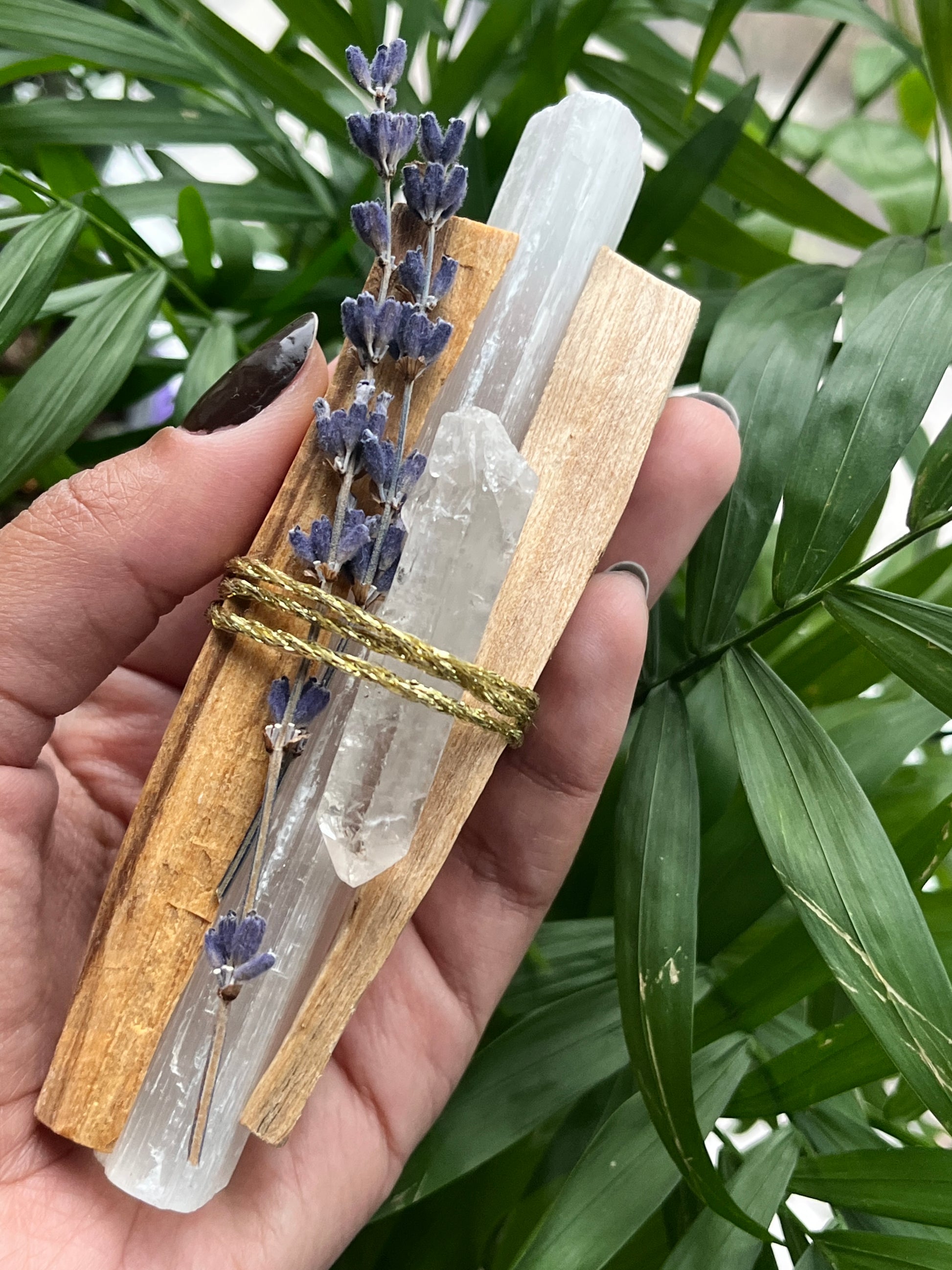 Energy cleansing bundle including 2 sticks of palo santo, 1 stick of selenite, lavender and a clear quartz point.