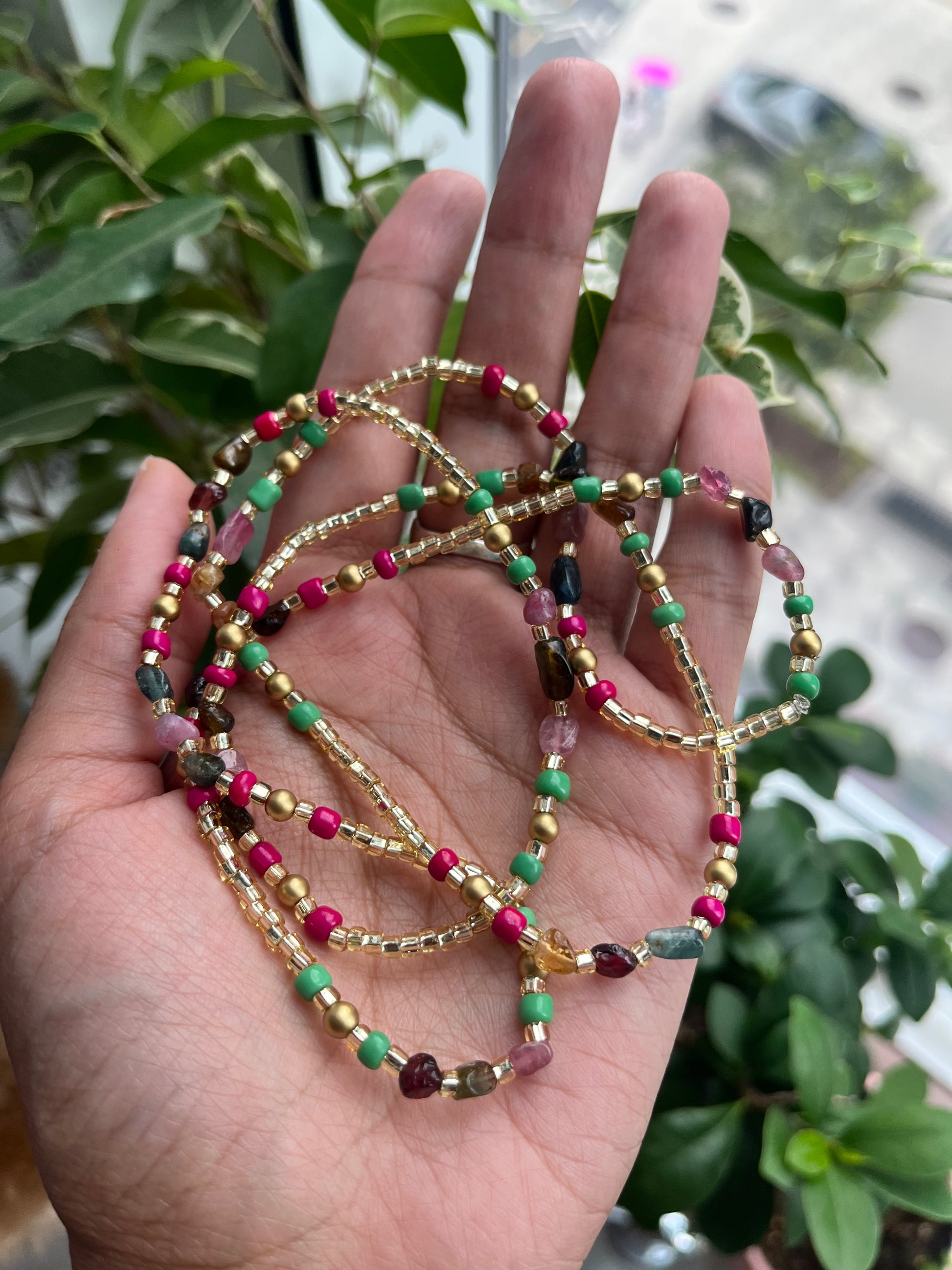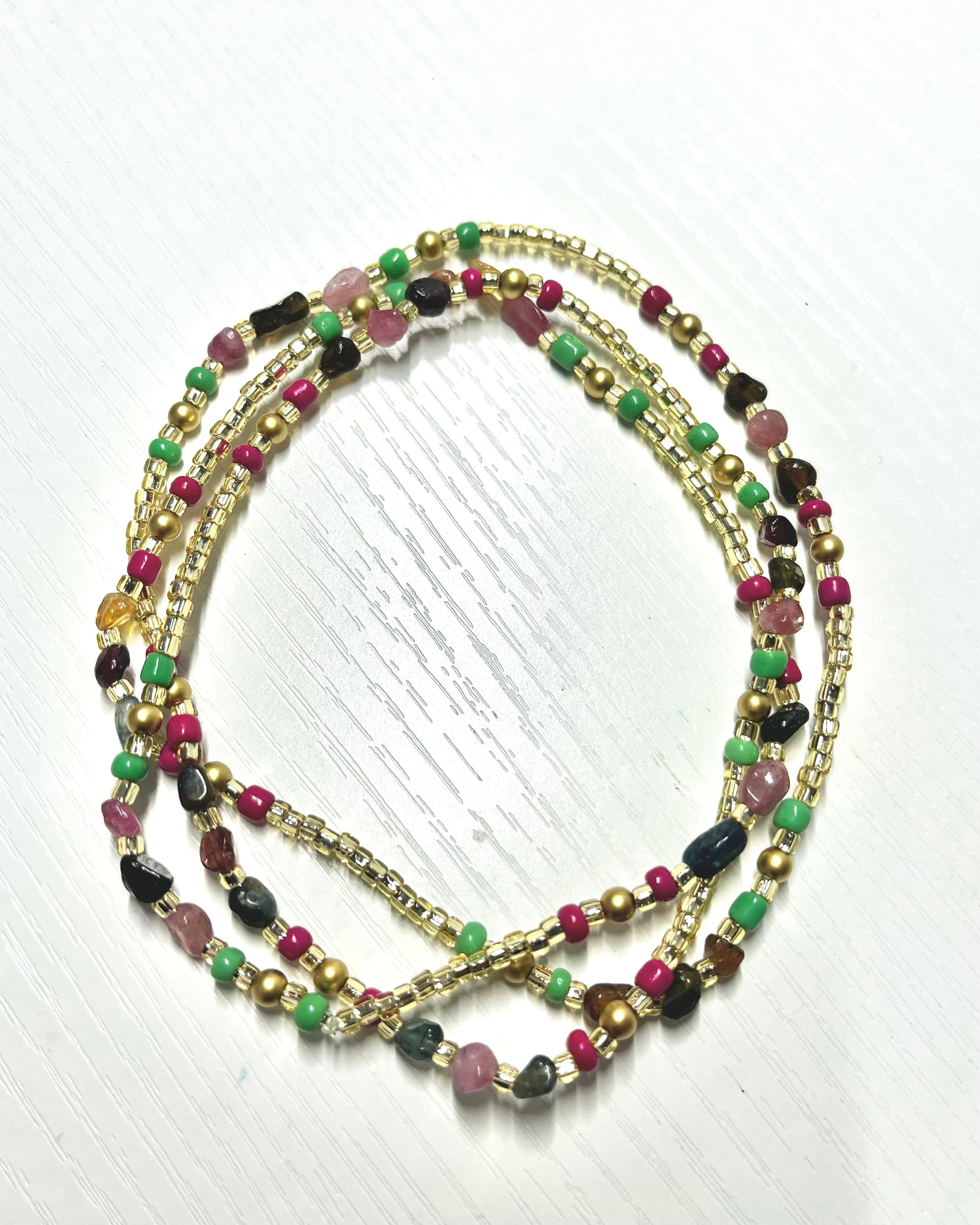 Pink and green, watermelon tourmaline stretchy waist beads.
